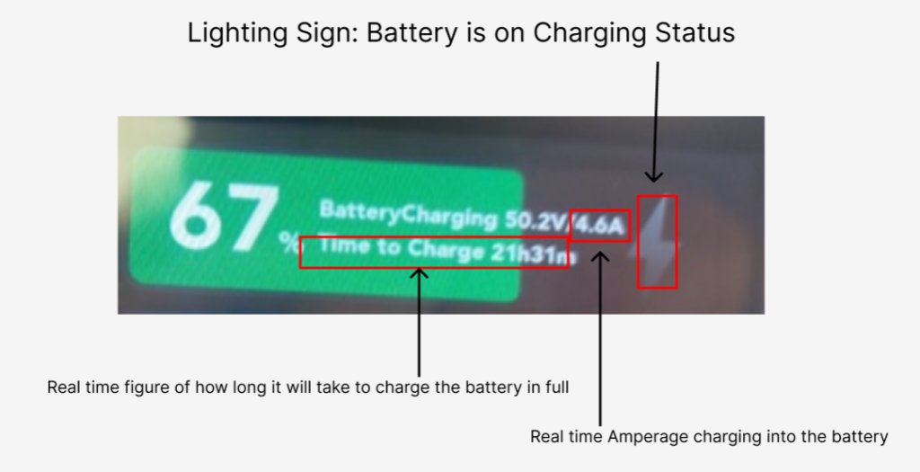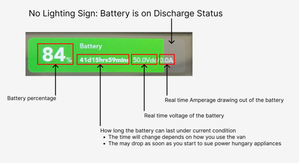 - If the “real-time amperage drawing out of the battery” on the monitor is XX A and the lighting sign is on, it means you are using less power than the solar panels produce, and there is a surplus of XX A charging into the battery.